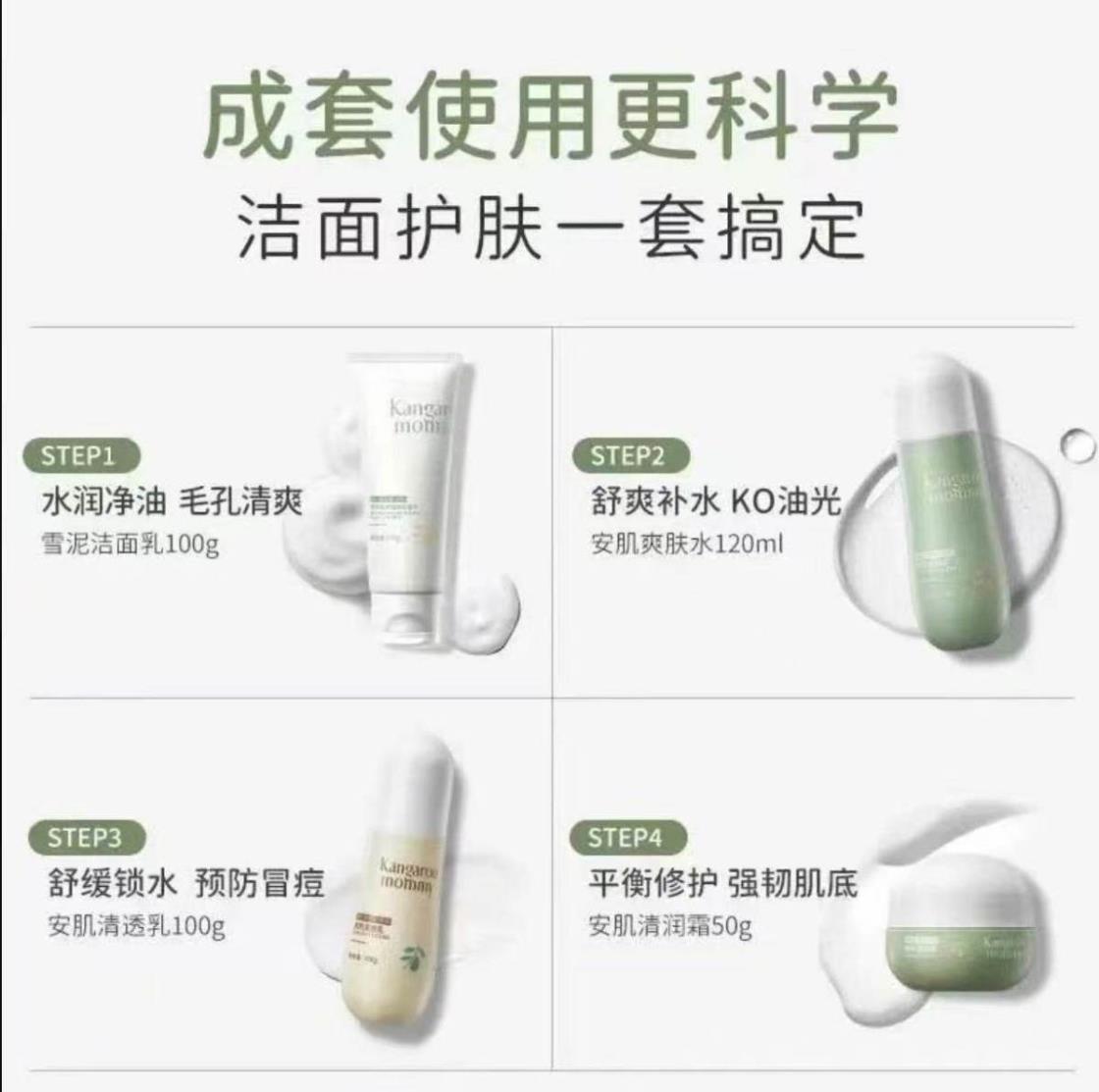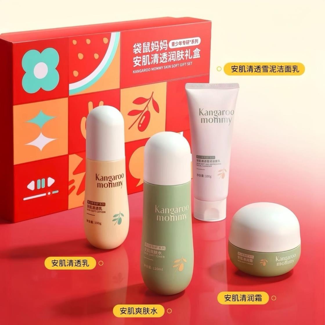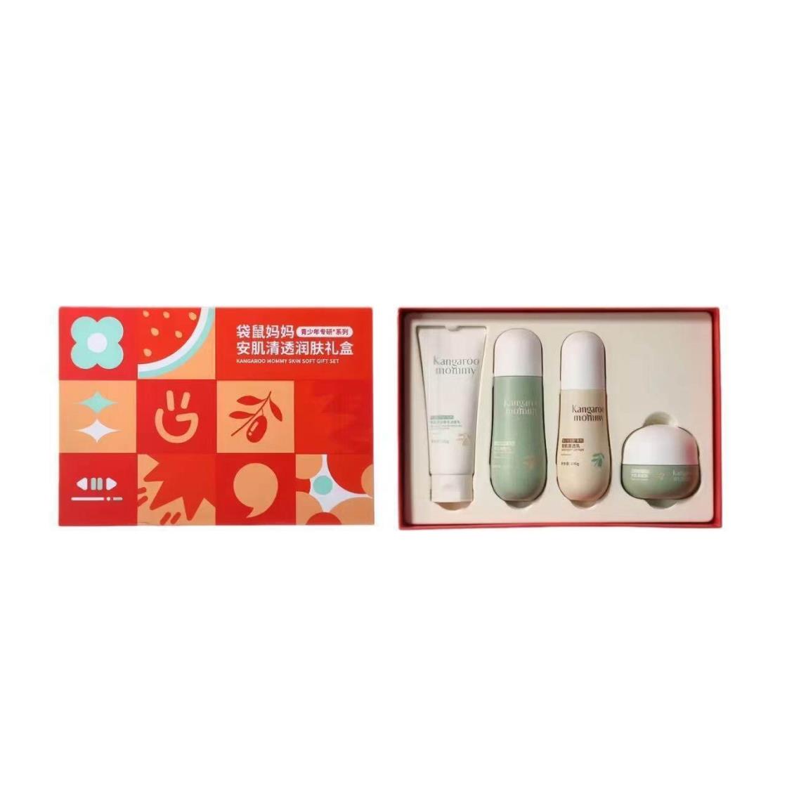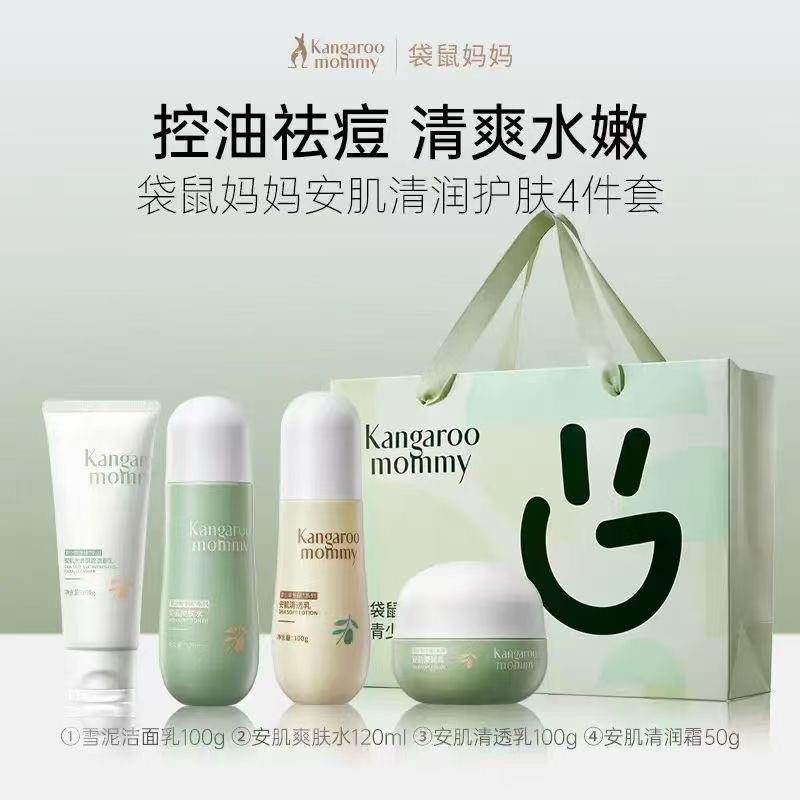 袋鼠妈妈安肌护肤4件套儿童洁面水乳护肤套装青少年控油补水送礼【刮码发货 介意慎拍】