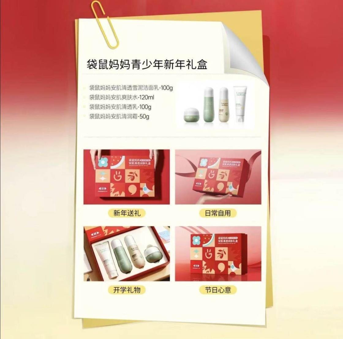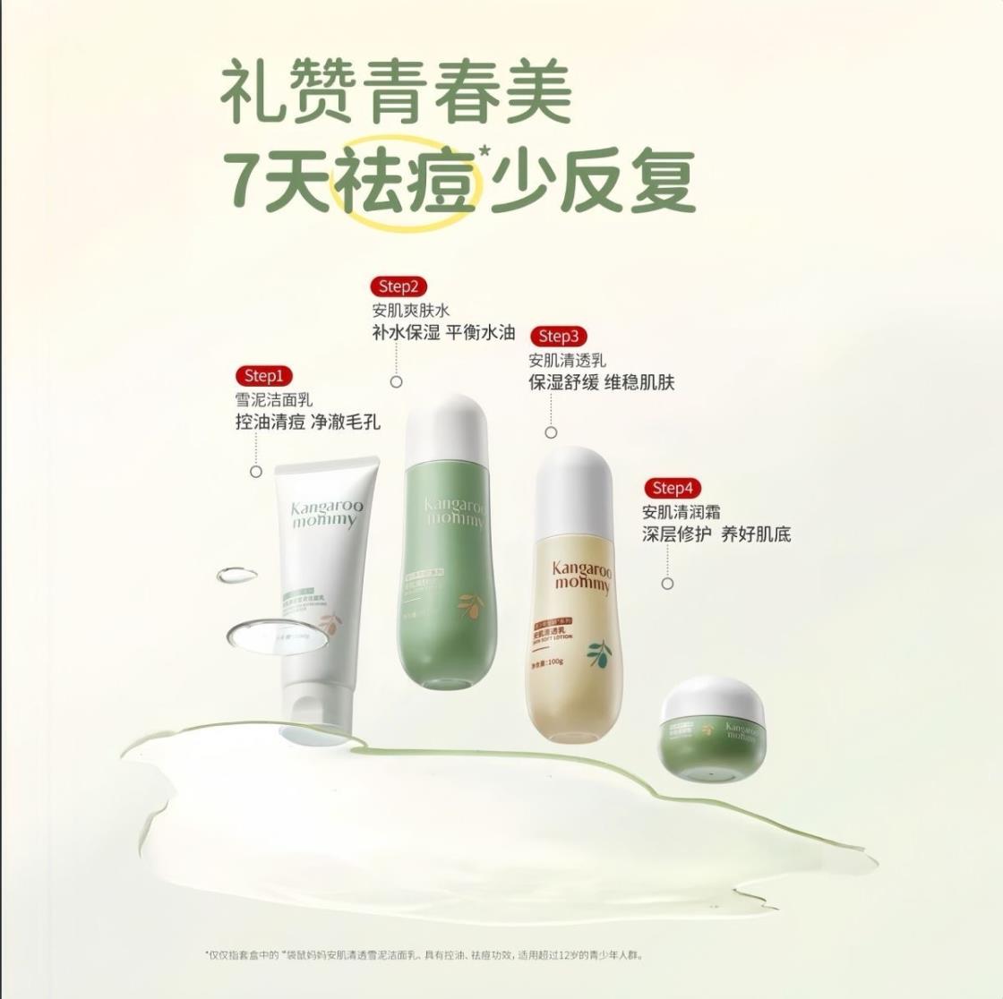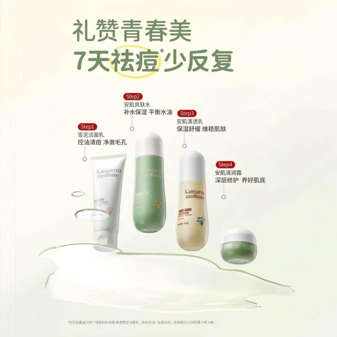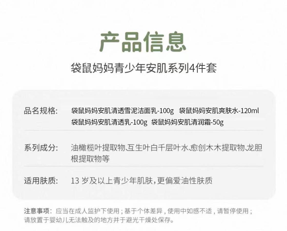 袋鼠妈妈安肌护肤4件套儿童洁面水乳护肤套装青少年控油补水送礼【刮码发货 介意慎拍】